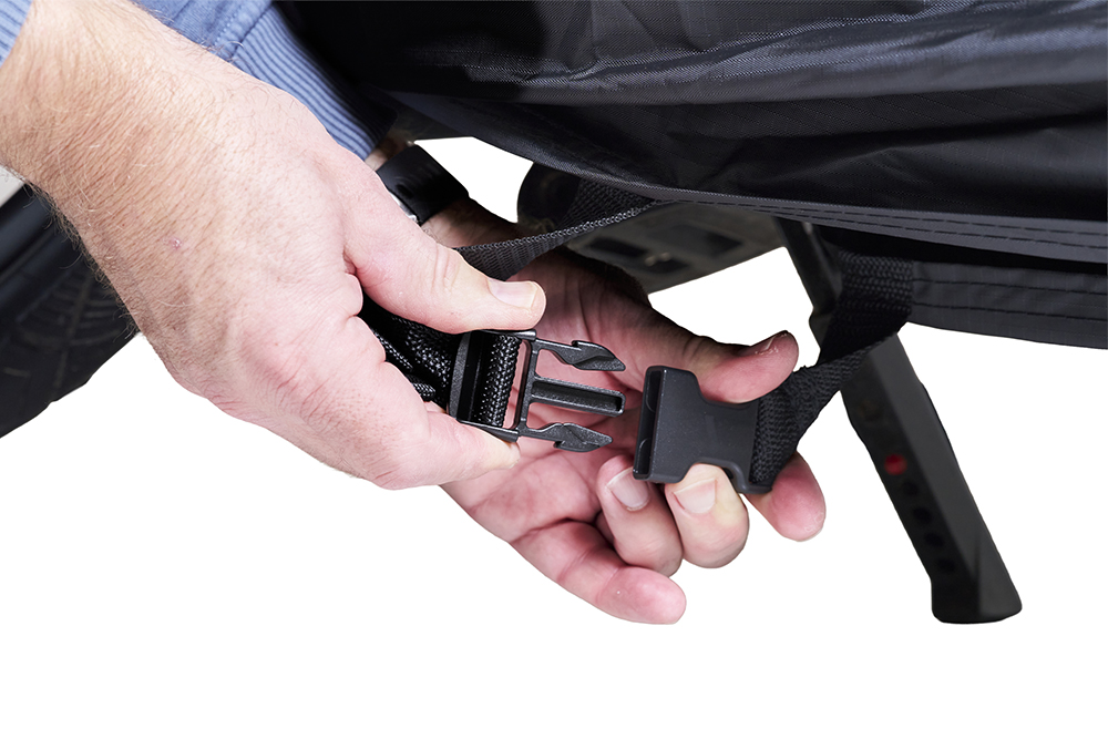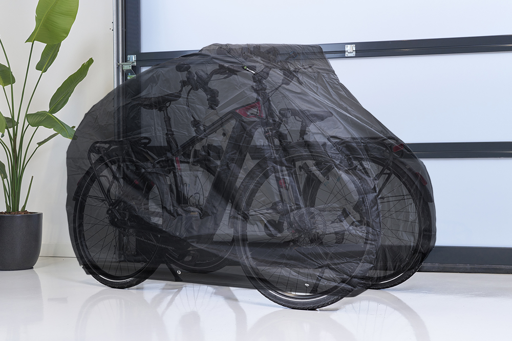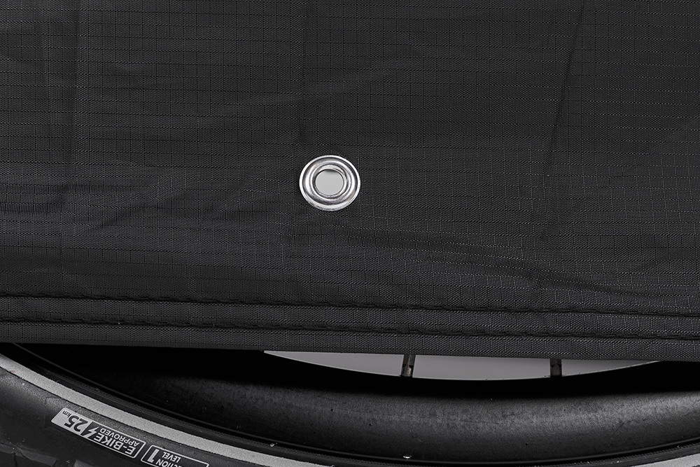 Dankzij de elastische zoom en de verstelbare band met kliksluiting blijft de hoes stevig om beide fietsen zitten. De ringen in de zoom bieden extra borgingsmogelijkheden, handig in situaties waarin je de hoes extra wilt vastzetten. Daarnaast beschikt de hoes over slotgaten, waardoor beide fietsen samen met de hoes op slot gezet kunnen worden.